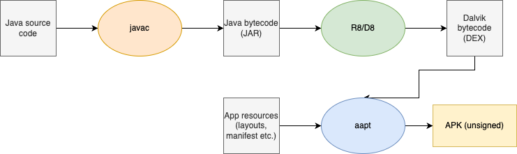For simplicity purposes, I've left out many parts of the build process in the diagram, but hopefully that shouldn't be a huge problem. As seen in the diagram, Java code is first compiled to Java bytecode using javac, then the resulting JAR is compiled to DEX files before being packaged up to the final APK file. Android doesn't understand the Java bytecode format so we have to do the conversion step.